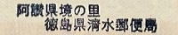 | 阿井郵便局(あい 62082) 四国八十八ヶ所霊場、第二十一番札所の太龍寺にちなみ、龍の絵入り。 なお、太龍寺は標高500m付近にあるため、道の駅鷲の里併設の鷲の里 駅から、全長約2.7kmの太龍寺ロープウェイに乗って、参拝することが できる。かつミンさん提供。 |