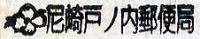 | 尼崎大物郵便局(あまがさきだいもつ 43488) 大物城や尼崎城があったため、お城の絵入り。局名の上の小さな文字は ひらがなで「だいもつ」となっている。柳穂さん提供。 おばけのQ太郎さん訪局時では右側のものに変更になっていたが、全体的 な感じに変わりはない。 さらに、たみっちゃん2さんが29-11-02に訪局したときのものが右側下の ものである。屋根の幅等に変化が見られる。 |