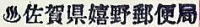 | 嬉野郵便局(うれしの 77011) 市中心部には、日本三大美肌の湯の一つとして知られる嬉野温泉がある ため、温泉マークの絵入り。 R02-06-22かつミンさん訪局時は赤色インク使用。 R06-10-22じゃが伸さん赤色インクで使用確認。 |